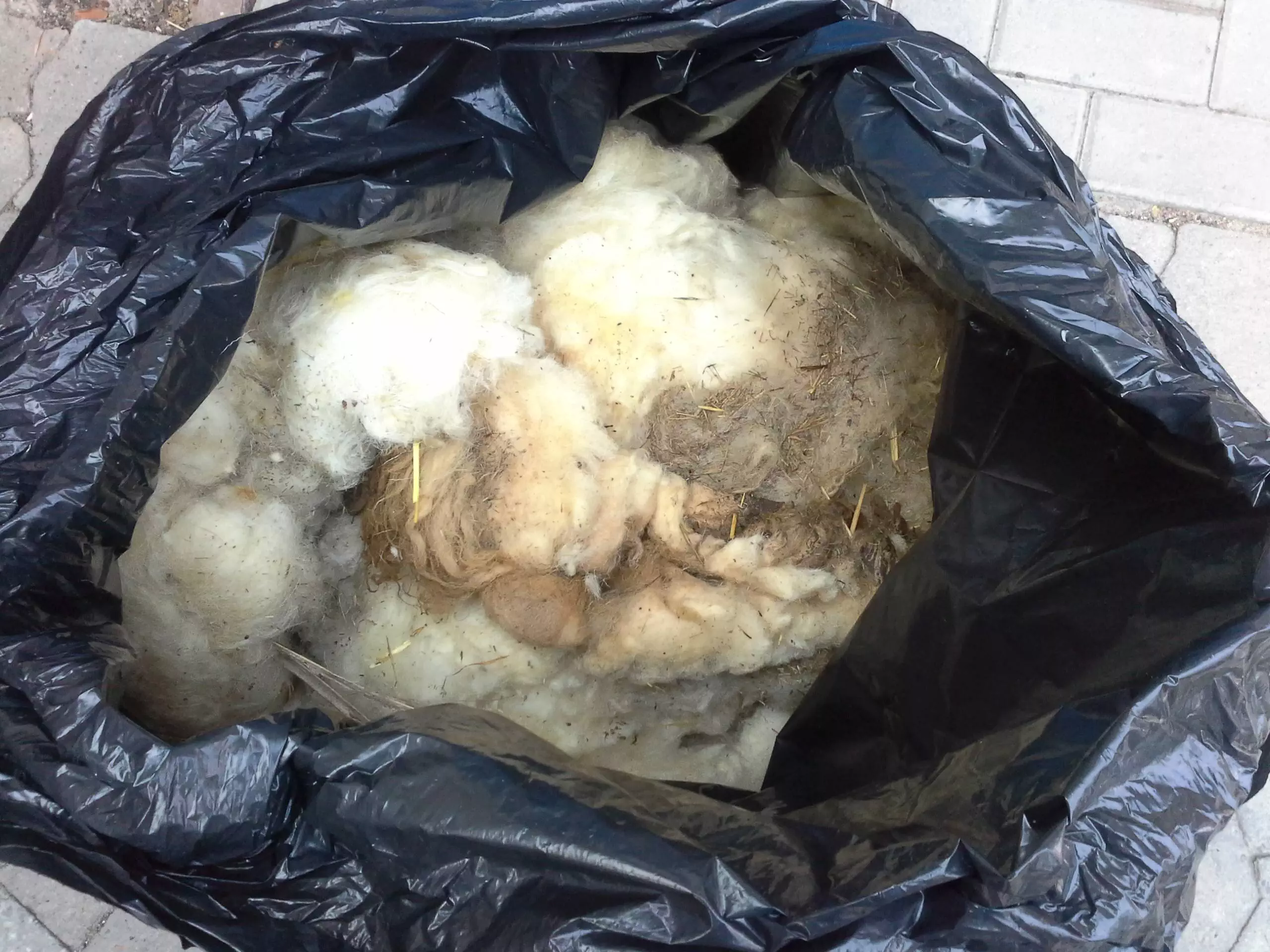 Das Wochenende kam näher und näher und somit auch das Projekt Waldschafvlies. Denn aufschieben lies sich die olfaktorische Bombe nun nicht mehr länger, es duftete streng, je nachdem wie der Wind stand, bereits im gesamten Garten. Dann ging es los: Zuerst zoppelte sie unter dem Carport die größten Klumpen Wolle mit anhängendem „Popo“ vom Vlies, stoppte ihre Beute in einen Zuber und den aussortierten Mist in die Tonne.