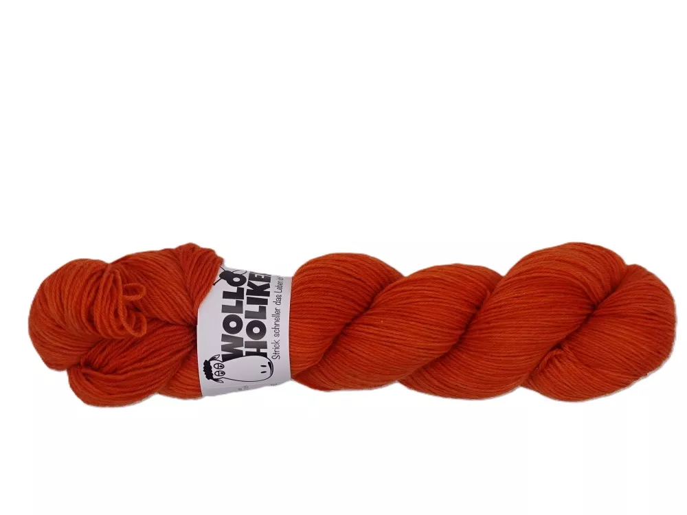 100 g Sockenwolle der Wolloholiker-Qualität Basic in der Färbung Kürbissuppe – viel zu schade um „nur“ Socken daraus zu stricken.